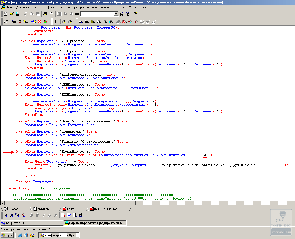 Недавно некоторые наши клиенты столкнулись с проблемой выгрузки в клиент-банк платежных поручений с четырехзначными номерами, в процессе формирования файла выгрузки 1С Бухгалтерия 7.7 обрезает номер платежки до 3 знаков, тем самым делая автоматическую передачу платежных поручений невозможной. Ничего нового в этой проблеме нет, кроме того, что 1С так и не спешит устранять этот недочет. То-ли считает проблему несущественной, то-ли все силы брошены на продвижение 1С 8. Поэтому исправлять придется самостоятельно, тем более это совсем несложно.