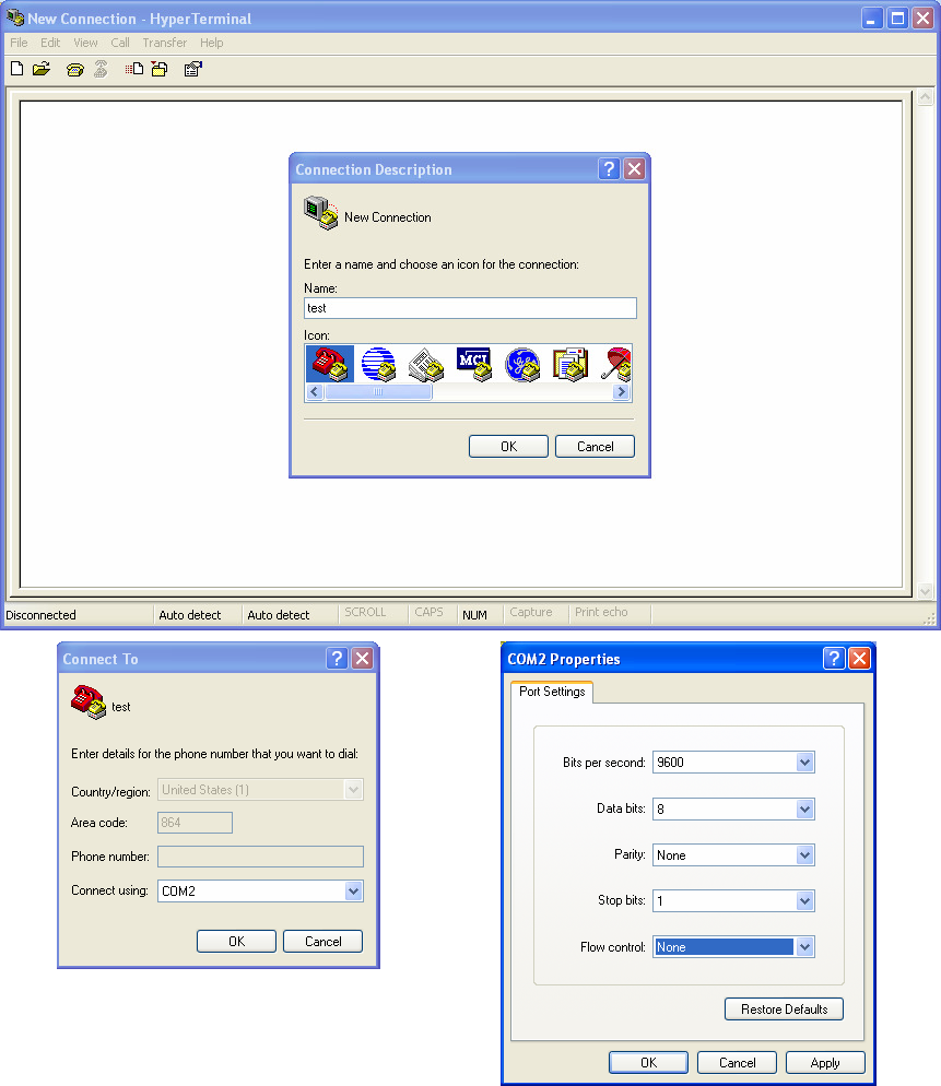 Проверить это можно следующим образом: для сканера с эмуляцией разрыва клавиатуры достаточно открыть Блокнот, для RS-232 сканеров можно воспользоваться программой Hyper Terminal. В последнем случае создайте новое соединение и укажите параметры связи с портом сканера.
