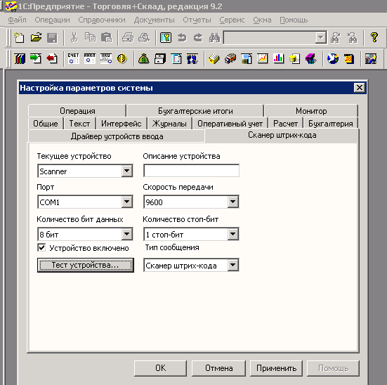 Для проверки можете нажать кнопку Тест устройства и считать произвольный штрих-код, в открывшемся окне должно появиться значение штрих кода.