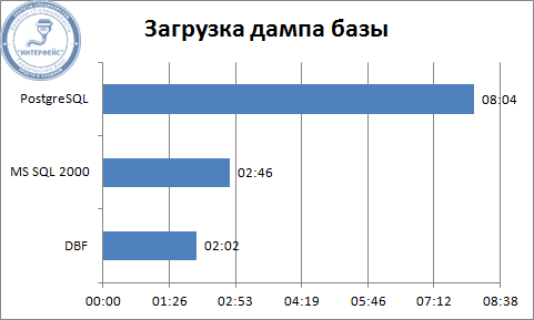 Результаты в файловом режиме и c использованием MS SQL 2000 незначительно отличаются друг от друга, явный аутсайдер PostgreSQL, возможно дает о себе знать транслятор SELTA, но в любом случае результат неудовлетворительный.