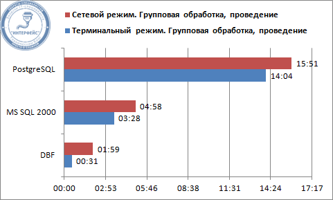 Скорость проведения документов один из наиболее важных параметров, характеризующих быстродействие ИБ. В нашем случае использовалось групповое проведение документов за неделю в сетевом и терминальном режиме. Два дополнительных ПК выполняли во время тестирования дополнительную нагрузку на ИБ в виде заранее предопределенного набора действий (ввод новых документов, проведение, подбор остатков, печать), характерных для повседневной деятельности фирмы.