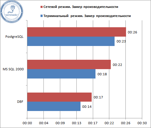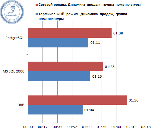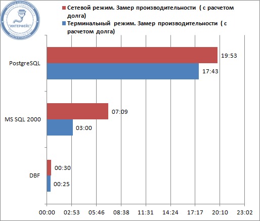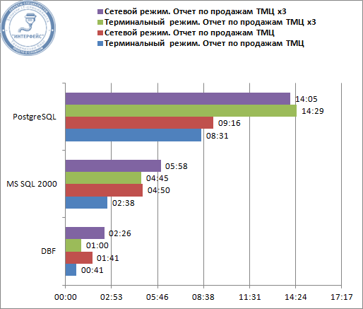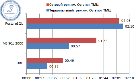 В качестве тестовой использовалась информационная база конфигурации "Торговля и склад" реального оптово-розничного предприятия за 6 месяцев. Тесты отражают реальные условия эксплуатации данной информационной базы.Тестировались следующие режимы:
