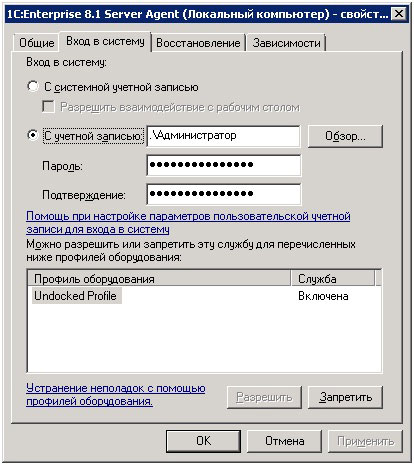 Начнем с 1С:Предприятие 8.1. Сам процесс мы описывать не станем, т.к. ничего сверхъестественного в этом нет. После установки идем в Пуск - Панель управления - Администрирование и запустим консоль Службы. Зайдем в свойства службы Агент сервера 1С:Предприятие 8.1 (1C:Enterprise 8.1 Server Agent) и убедимся, что она запускается от Пользователя с правами администратора или с системной учетной записью.