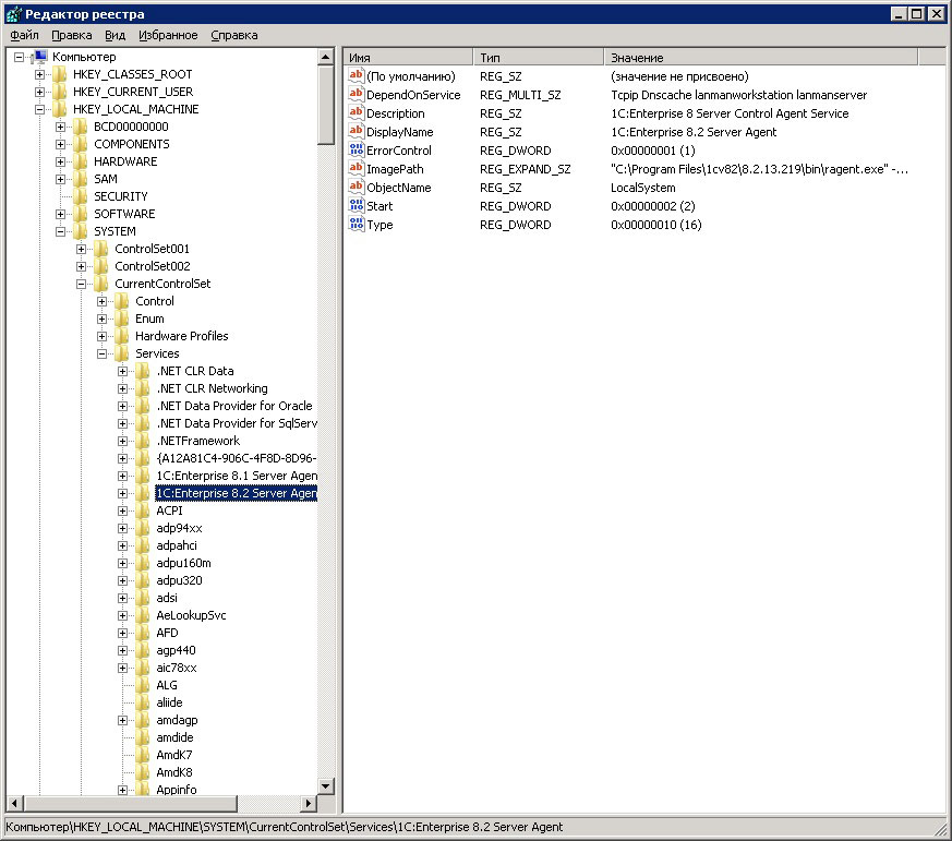 1"C:\Program Files\1cv82\8.2.13.219\bin\ragent.exe" -srvc -agent -regport 1541 -port 1540 -range 1560:1591 -d "C:\Program Files\1cv82\srvinfo"