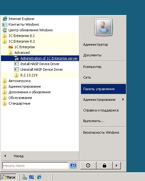 Далее заходим в Консоль администрирования 1С:Предприятия 8.2 (Administration of 1C Enterprise server)