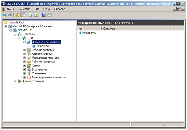 Для проверки подключим БД FirmaBase82. В результате картина в Консоли администрирования 1С:Предприятия 8.2 будет следующая: