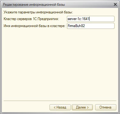 Для подключение к этой базе с рабочей станции во время добавления БД в поле Кластер серверов 1С:Предприятия к названию сервера добавим еще и порт кластера 1641: