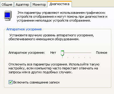 Изучив информацию в окне с ошибкой стало ясно, что причиной сбоя служит библиотека gdiplus.dll, что позволило выдвинуть первые предположения о причинах такого поведения системы. Данная библиотека относится к подсистеме GDI+ которая является улучшенной средой для 2D графики и входит в состав Windows XP / Vista / Server 2003. Следующим шагом стало изучение аппаратной составляющей компьютера, который представлял собой обычный офисный ПК на базе интеловского чипсета G45. Никаких отклонений от нормального режима работы при беглой диагностике обнаружено не было, однако было очевидно что причина сбоев связана с видеоподсистемой. Классический прием в таких случаях - понижение уровня аппаратного ускорения, что и было сделано (Панель управления - Экран - Параметры - Дополнительно - Диагностика).