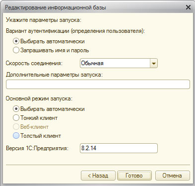 В данном случае все текущие и вновь созданные базы будут использовать релиз 8.2.13.205, так как по умолчанию в качестве используемой версии 1С Предприятие указывается 8.2. Для баз, требующих более свежий релиз, нужно воспользоватся кнопкой Изменить в диалоге запуска и в соответствующем окне указать необходимую версию.