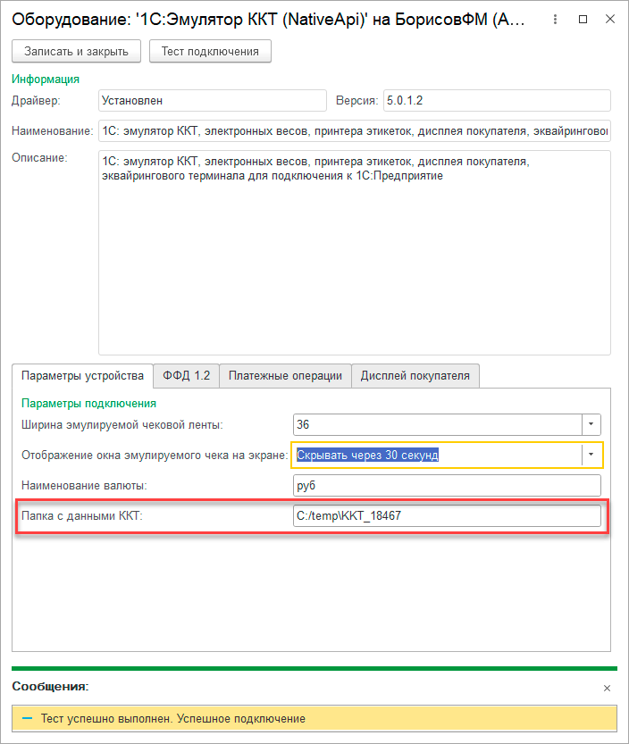 Прежде всего даже не пытайтесь настроить время отображения на экране, в текущей версии окно с результатами работы ККТ быстро промелькивает и нет никакой возможности увидеть его содержимое. Поэтому запомните путь к логу, он указан ниже, там можно будет найти все пробитые чеки в XML-формате и проконтролировать содержимое всех необходимых полей.