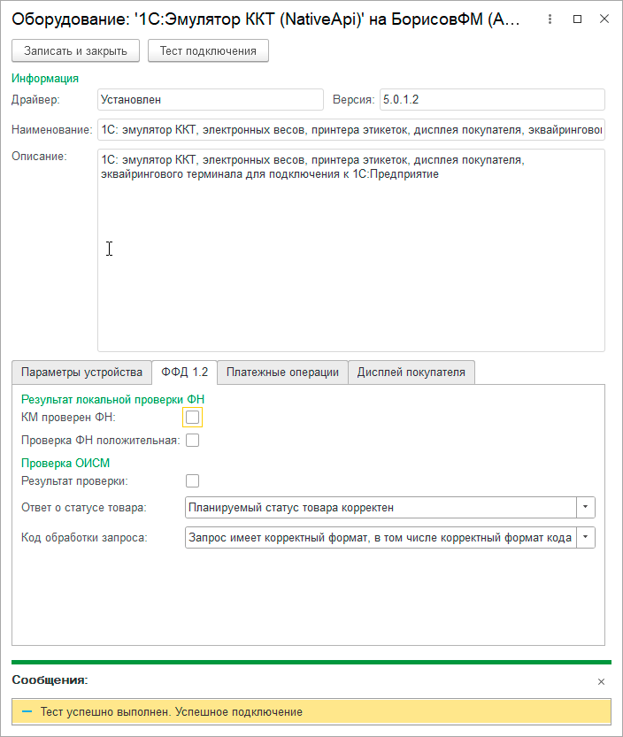 Также на закладке ФФД 1.2 настройте эмуляцию работы с маркированным товаром, здесь можно указать поведение как при проверке марки средствами ФН, так и эмулировать работу с ОИСМ:
