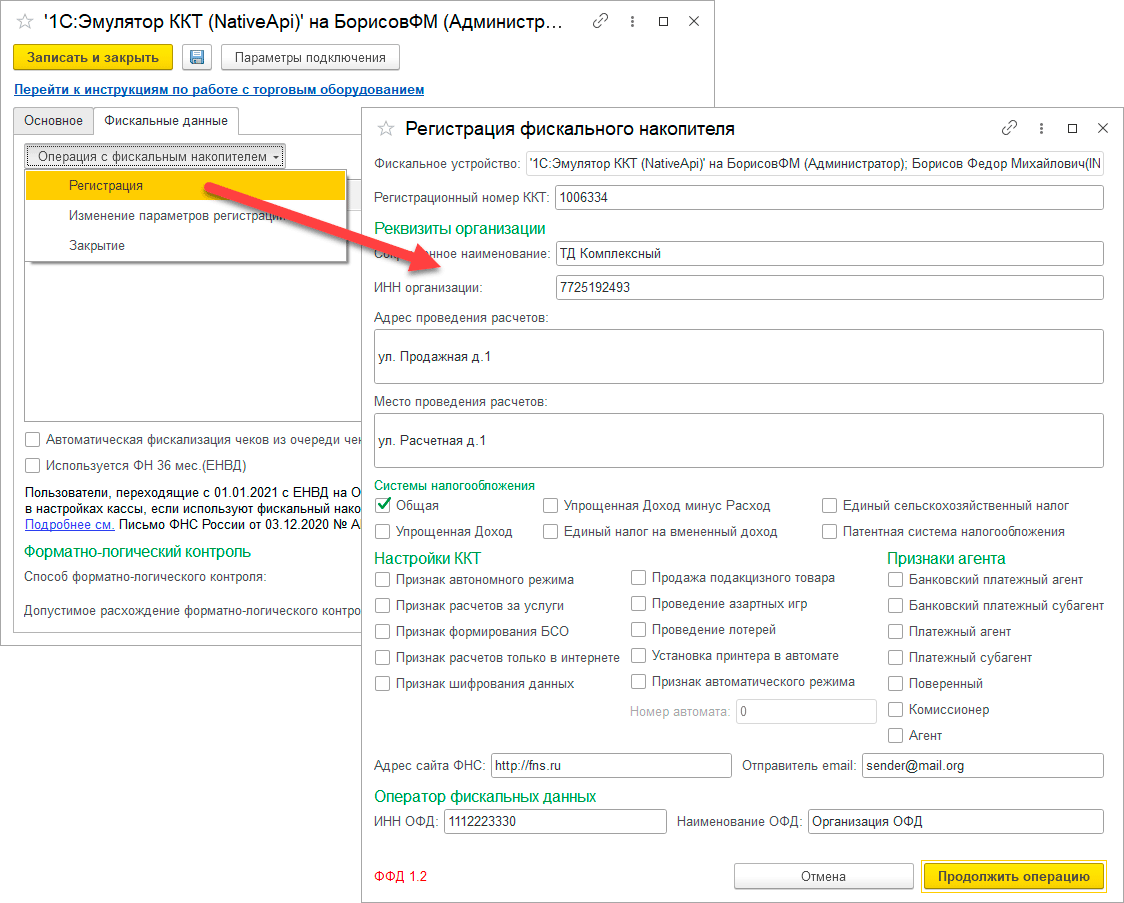 Перед тем как пользоваться экземпляром виртуальной кассы нам нужно выполнить регистрацию виртуального ФН, иначе вы получите ошибку при попытке пробить чек. Здесь все по-взрослому, как с настоящим ФН, поэтому вы можете смело тестировать самые разные сценарии или обучать младший технический персонал.