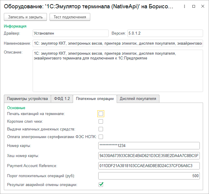 Закладка Платежные операции в настройках эмулятора относится к эквайринговому терминалу, но настройки можно выполнять в любом экземпляре оборудования, они сквозные. Здесь нужно обратить внимание на опции Печати чеков, так как без нее вы не увидите слип чека, с включенной опцией слипы будут также сохраняться в папку с логами и Порог положительных операций - все что меньше этой суммы будет автоматически одобряться, если больше "банк" будет отказывать в проведении платежа.