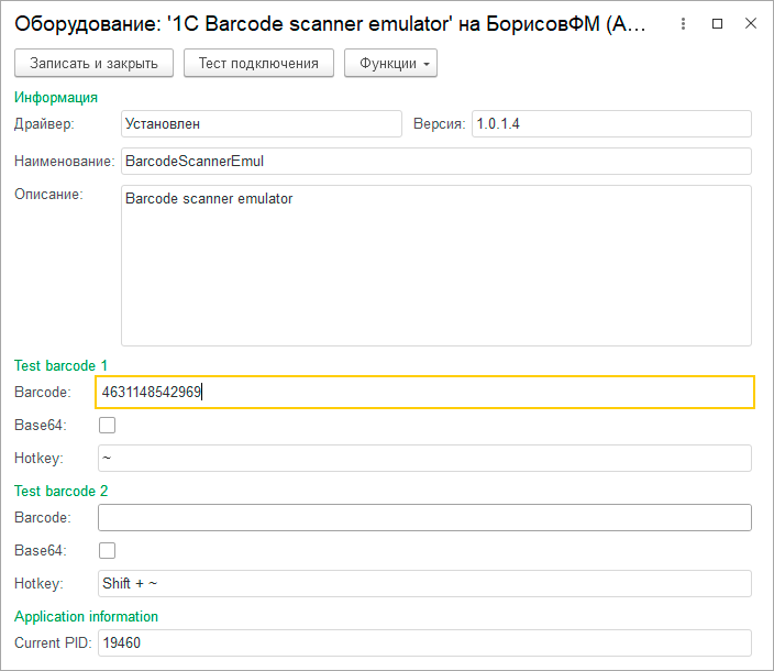 Эмулятор сканера штрихкода позволяет повесить на две горячие клавиши два заранее предопределенных штрихкода, если мы оставим пустое значение, то при вызове этого сочетания клавиш получим приглашение ввести штрихкод. Если штрихкод содержит непечатаемые символы, например, Datamatrix с символами FNC1, GS используемыми в маркировке, то такой код следует закодировать в Base64 и установить соответствующий флаг в настройках.