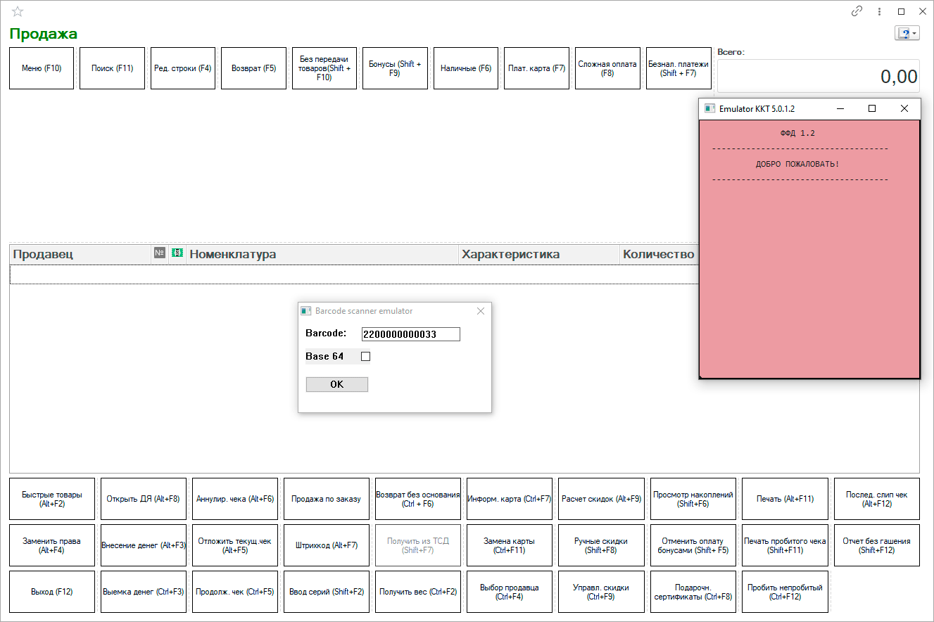 Теперь давайте посмотрим, как все это работает, сразу при входе в РМК подключается дисплей покупателя и его окно перекрывает все активные окна, т.е. всегда на виду. Далее мы можем работать как обычно, подбирать товар через поиск, быстрые товары или эмулировать ввод со сканера. Ниже показано окошко запроса штрихкода, если он не был указан при настройке эмулятора.