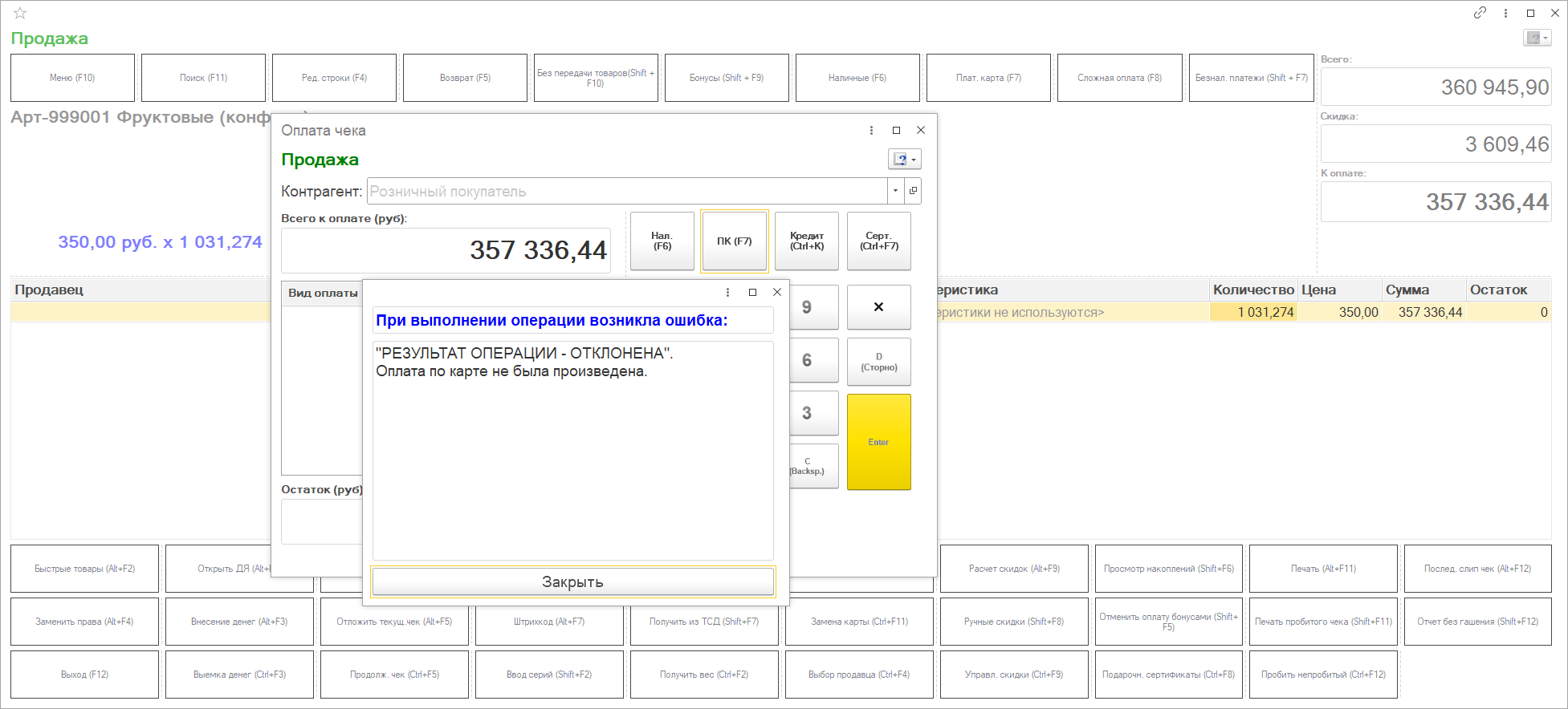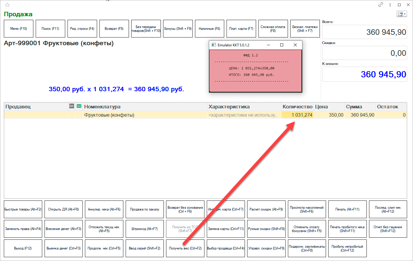 Для работы с весами просто достаточно выбрать весовой товар и нажать кнопку Получить вес, будет передано случайное число в диапазоне от нескольких десятков, до нескольких тысяч. Возможно, подразумеваются граммы, но никаких дополнительных настроек у эмулятора нет и цифры в чеке получаются просто космические. Не хотите взять по сходной цене тонну конфет? Но для задач настройки и тестирования это не имеет никакого значения. Главное, что эмулятор работает и передает в программу данные.