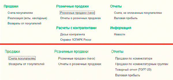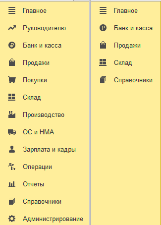 А вот если мы попытаемся найти настройки интерфейсов, то нас постигнет фиаско. В управляемом приложении интерфейс рабочей области формируется автоматически, на основе прав доступа. Для примера сравним интерфейсы Панели разделов Администратора и Менеджера по продажам: