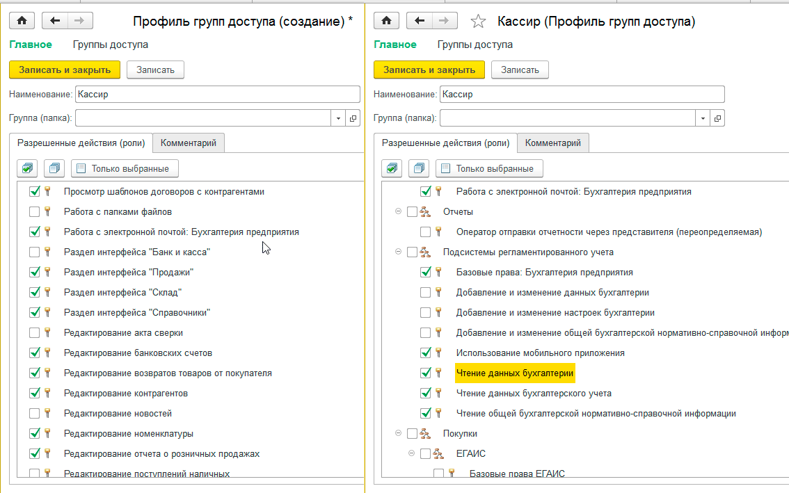 Поэтому найдем наиболее подходящий для наших задач профиль, в нашем случае это Менеджер по продажам, и сделаем его копию, которой дадим название Кассир. Теперь мы можем настраивать права по собственному усмотрению. Однако плоский список, предлагаемый по умолчанию, не совсем удобен для работы, если только вам не нужно быстро найти уже известную вам опцию, в большинстве случаев гораздо удобнее работать со списком включив группировку по подсистемам.