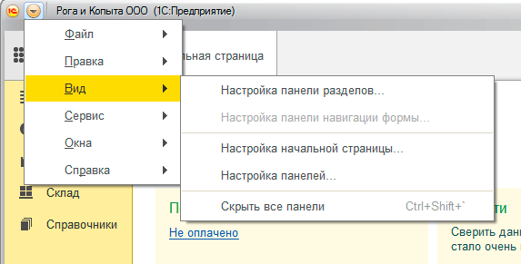 Начнем с настройки панели разделов, в нашем случае ассортимент был ограничен коротким списком услуг, поэтому раздел склад оказался лишним, чтобы не усложнять и не утяжелять интерфейс просто уберем его.