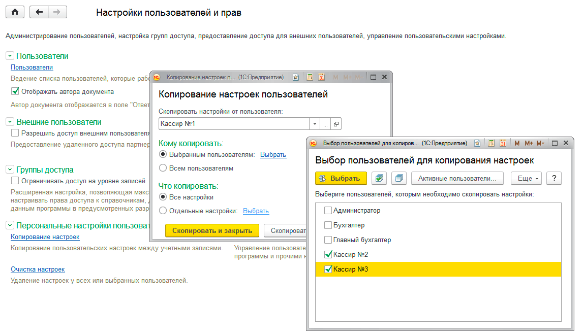 Теперь снова войдем в программу под администратором и перейдем в Администрирование - Настройки пользователей и прав - Персональные настройки пользователей - Копирование настроек. Наша задача распространить сделанные нами изменения на оставшихся пользователей группы Кассиры. Сама операция достаточно проста: выбираем пользователя, настройки которого мы копируем, указываем кому и выбираем что именно.