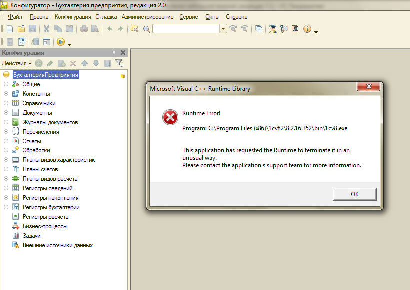 Как это обычно и бывает, ошибка проявилась в самый неожиданный момент, при штатном обновлении информационной базы на очередной релиз. Доходя до определенного момента платформа просто падала с абсолютно неинформативной ошибкой.