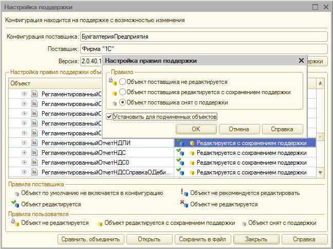 Теперь можем сохранять конфигурацию и обновлять конфигурацию базы данных, не забыв вернуть замененный объект на поддержку.