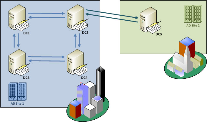 Здесь мы вплотную подошли к понятию сайтов AD, которые не следует путать с интернет сайтами. Сайты Active Directory представляют способ физического деления структуры службы каталогов на области отделенные от других областей медленными и/или нестабильными каналами связи. Сайты создаются на основе подсетей и все клиентские запросы отправляются в первую очередь контроллерам своего сайта, также крайне желательно иметь в каждом сайте свой глобальный каталог. В нашем случае потребуется создать два сайта: AD Site 1 для центрального офиса и AD Site 2 для филиала, точнее один, так как по умолчанию структура AD уже содержит сайт, куда входят все ранее созданные объекты. Теперь рассмотрим как происходит репликация в сети с несколькими сайтами.
