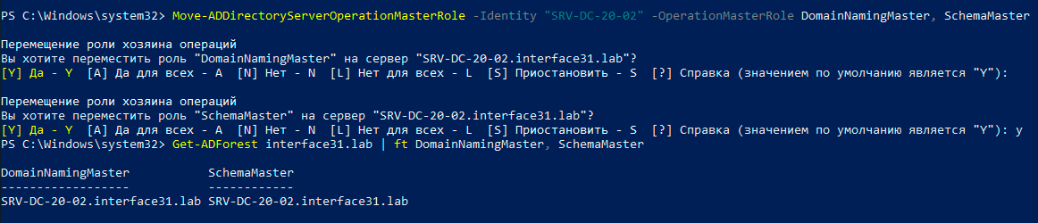 Где в опции -Identity укажите имя нового хозяина, а в -OperationMasterRole перечислите через запятую все передаваемые роли. Данную команду можно выполнить на любом контроллере домена, в том числе на том, который не является ни старым, ни новым хозяином. Указанной выше командой мы передали контроллеру SRV-DC-20-02 роли Хозяина именования домена и Хозяина схемы.
