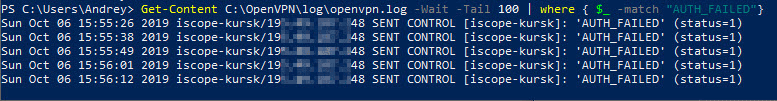 1Get-Content C:\OpenVPN\log\openvpn.log -Wait -Tail 100 | where { $_ -match "AUTH_FAILED"}