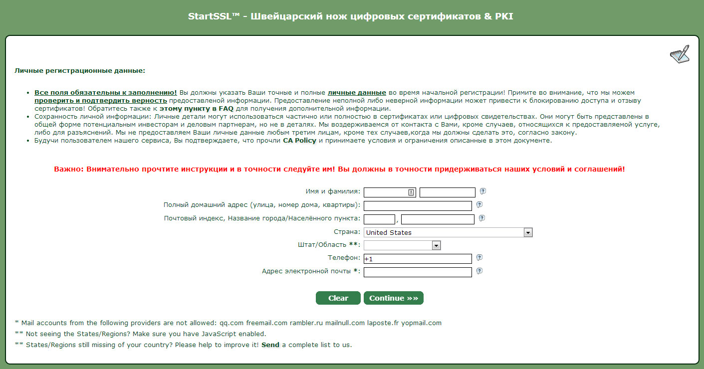 С одной стороны "настоящий" сертификат стоит не так уж и дорого, с другой - обосновать необходимость его приобретения для обеспечения удаленного доступа к почте для двух-трех сотрудников бывает довольно сложно. Поэтому самое время присмотреться к предложению компании StartSSL, которая позволяет получить сертификат начального уровня (1 класс) бесплатно.