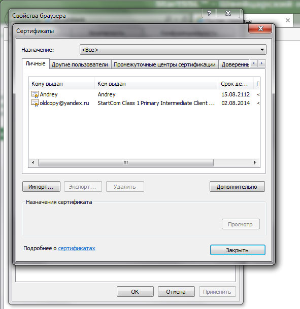 Сайт также произведет попытку его автоматической установки в хранилище, поэтому для этой операции лучше использовать Internet Explorer, хотя у нас не возникло никаких проблем при работе с Google Chrome. Открыв хранилище убедимся, что сертификат получен и установлен.