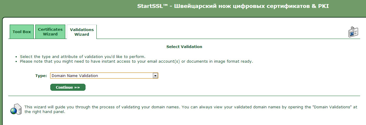 Перед тем как начать процедуру получения сертификата следует выполнить валидацию домена, для которого вы хотите получить сертификат.