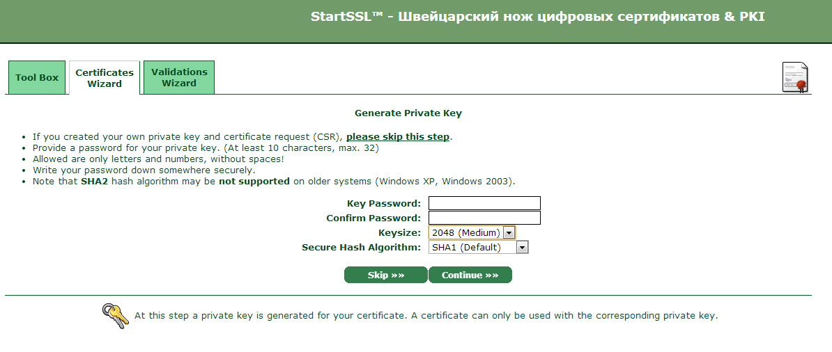 Перед созданием сертификата вам будет предложено создать закрытый ключ или пропустить этот шаг, если закрытый ключ уже получен.