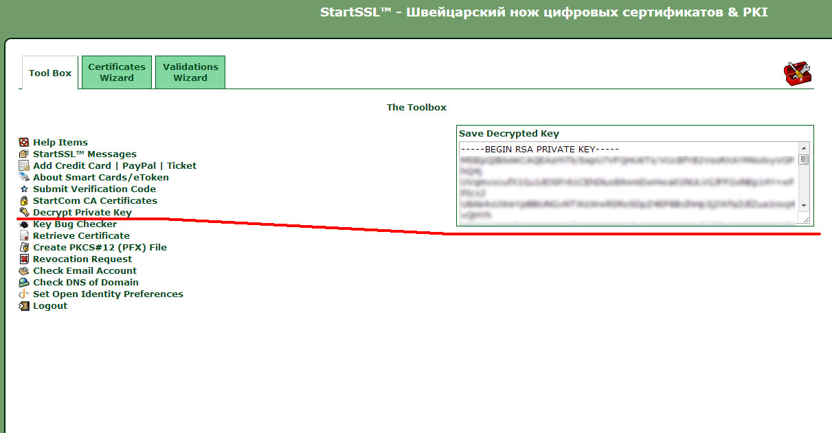 Полученный ключ следует скопировать и сохранить в файл с расширением .key, ключ поставляется в зашифрованном виде и перед использованием его будет необходимо расшифровать. Для этого можно воспользоваться инструментом на панели Tool Box личного кабинета.