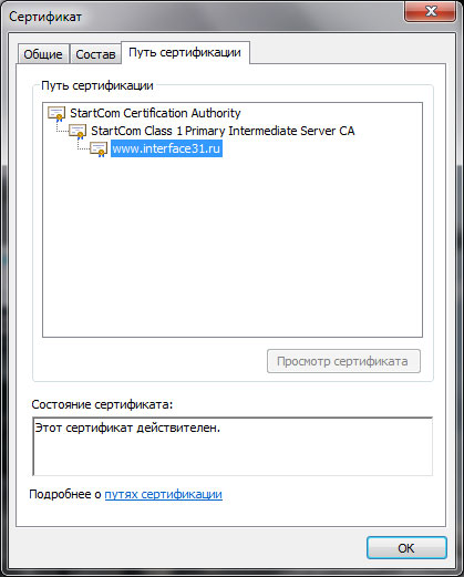 Процесс получения самого сертификата прост и мы не будем на нем останавливаться. Полученный сертификат следует сохранить в файл с расширением .crt, щелкнув два раза по созданному файлу можно просмотреть информацию о сертификате.