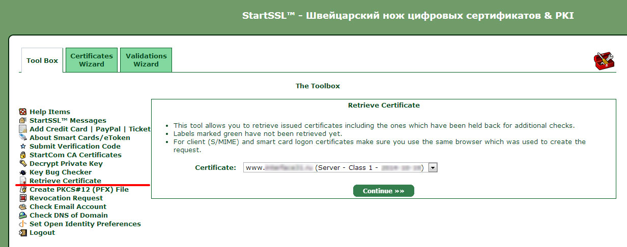 Также просмотреть и получить уже созданные сертификаты можно в разделе Retrieve Certificate закладки Tool Box.
