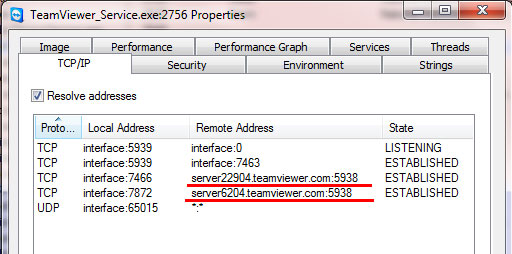 Но есть одна особенность. Если мы проанализируем сетевую актвность программы, то можем заметить, что она обязательно устанавливает соединения с хостами типа servernnnn.teamviewer.com