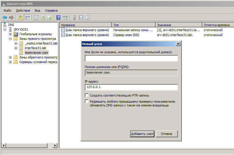 Если вы используете Windows Server, то с большой долей вероятности будете использовать роль DNS-сервера в этом качестве. Для реализации задуманного откроем оснастку и создадим в ней новую зону teamviewer.com. В этой зоне создадим А-запись с пустым именем указывающую на адрес 127.0.0.1