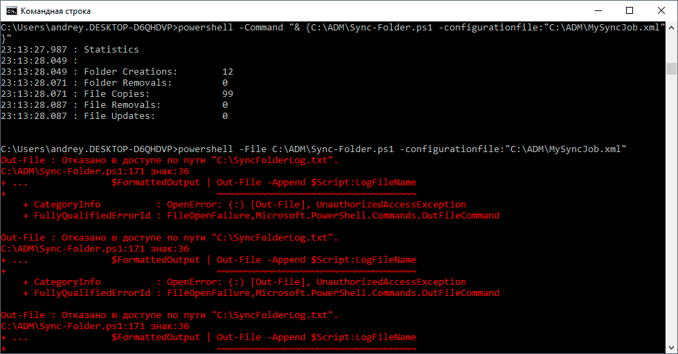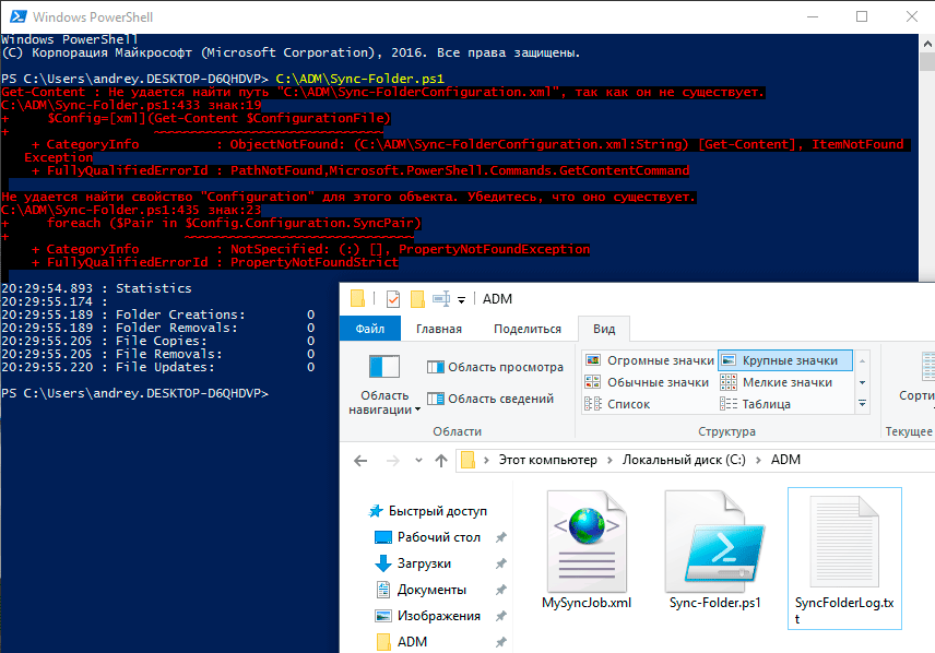 Давайте распакуем наш скрипт в произвольную папку, скажем C:\ADM и разместим там же файл конфигурации MySyncJob.xml. Будучи запущен без параметров скрипт ищет рядом с собой файл Sync-FolderConfiguration.xml и выполняет записанное в нем задание, это может быть удобно, но на наш взгляд удобнее давать конфигурационным файлам осмысленные наименования, что облегчит в последующем поиск нужных заданий, а также убережет от возможного нежелательного выполнения задания в случае случайного запуска скрипта. Все свои действия скрипт записывает в файл лога, который располагается в своей рабочей директории.