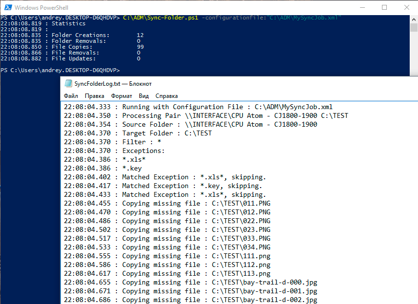 По результатам работы скрипта вы получите короткий отчет, более подробную информацию можно почерпнуть из лога, который очень хорошо читается и предоставляет исчерпывающую информацию, откуда и куда копируем, какой фильтр, какие исключения и какие именно действия были предприняты.