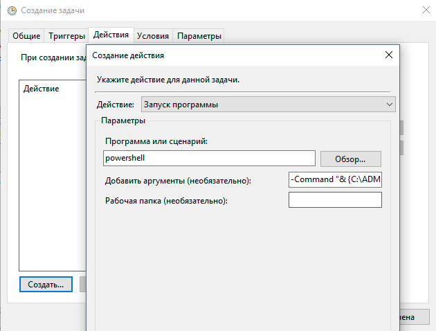 Чтобы добавить наш скрипт в планировщик заданий следует поступить аналогичным образом, создадим новую задачу, установим условия ее выполнения и на закладке Действия в качестве действия выберем Запуск программы, в поле Программа или сценарий укажем