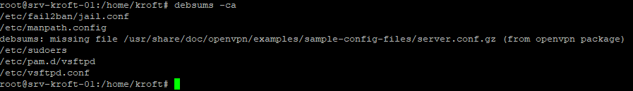 Прежде всего следует установить утилиту debsums, которая позволит сравнить контрольные суммы системных и конфигурационных файлов с эталонными. Это позволит быстро понять в какие конфиги вносились правки, а если выявится несовпадение контрольных сумм бинарных файлов или библиотек, то это может указывать, что система взломана и содержит вредоносное ПО, хотя есть вариант, что данные файлы были пересобраны или пропатчены вручную вполне легально. Но в любом случае это повод к проведению подробного расследования, которое выходит за рамки данной статьи.