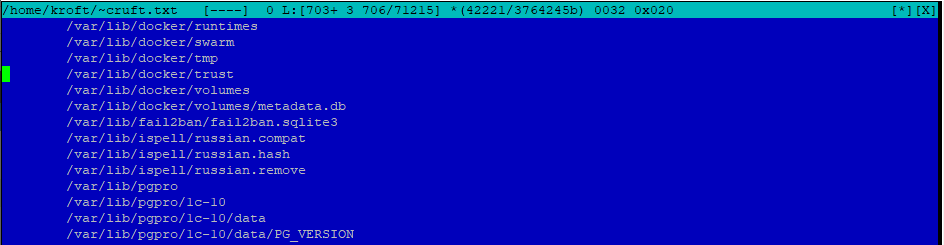 Что мы исключили? Загрузчик (/boot) который сформирован при установке системы и виртуальная файловая система с модулями ядра и драйверами (/sys), домашняя папка пользователя (/home/kroft), директории PostgreSQL (/var/lib/pgpro), их содержимое и происхождение нам понятно и вопросов более не вызывает.
