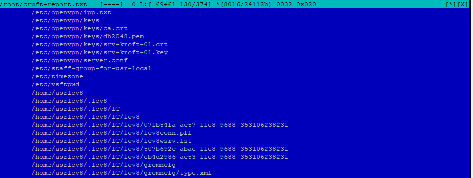 В приведенном фрагменте видны файлы настройки и ключи openvpn, а также факт установки сервера 1С:Предприятие. В дальнейшем можно снова сузить объем отчета, исключив понятные расположения и служебные директории. А также сразу выявить файлы конфигурации, которые следует изучить перед тем, как приступать к каким-либо работам.