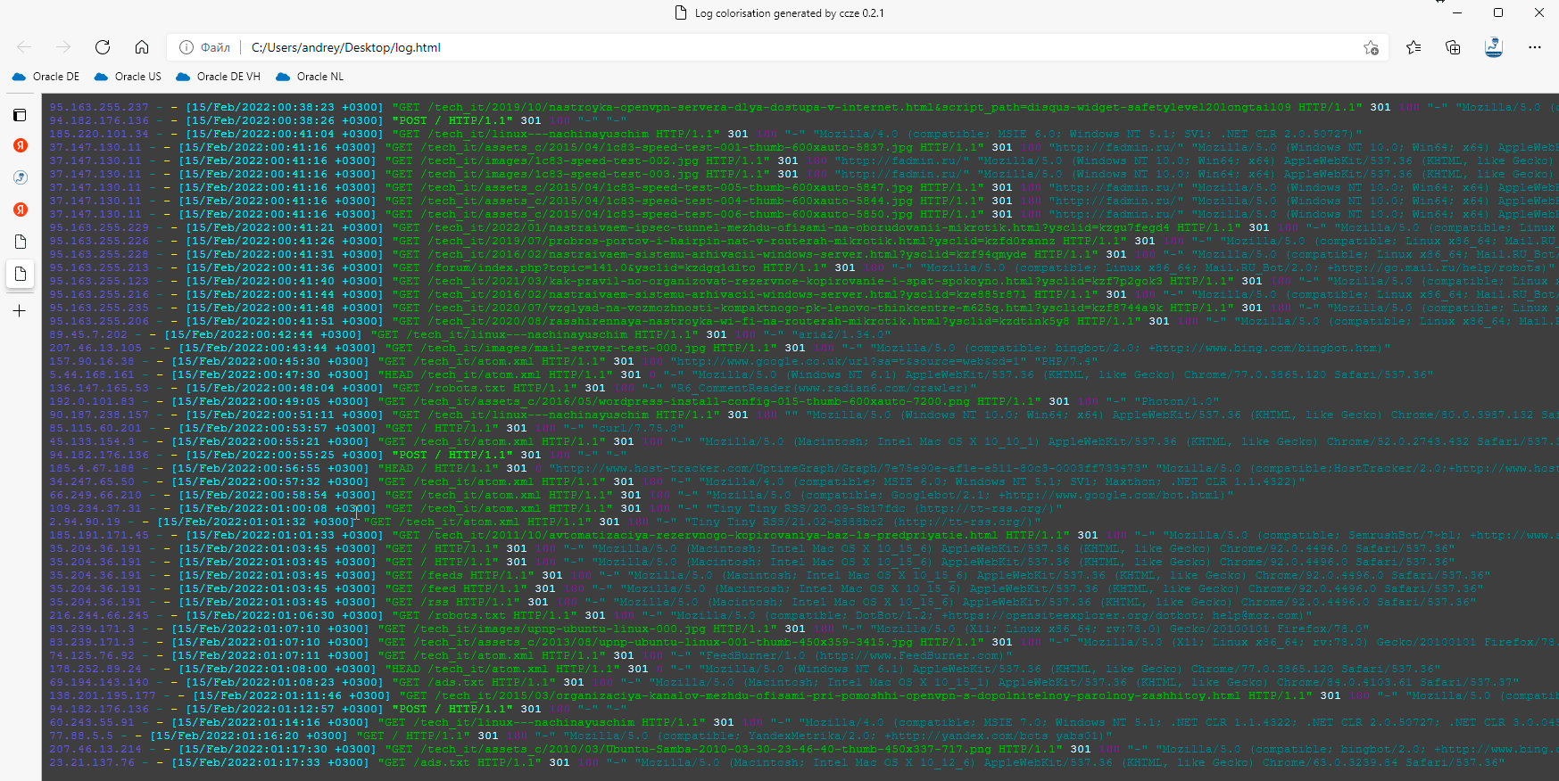 В нашем примере мы вывели 50 последних строк файла /var/log/nginx/access.log в файл log.html домашней директории текущего пользователя, теперь мы можем его скачать и спокойно изучить в браузере в раскрашенном виде на привычном рабочем месте:
