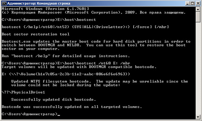 Для работы с загрузчиком в ОС семейства NT 6.x предназначена утилита bootsect, которая находится на установочном диске в папке boot. Будучи запущена без параметров она покажет справку, это полезно, если вы вдруг забыли синтаксис.