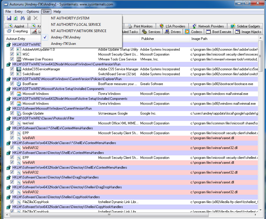 При запуске AutoRuns от имени Администратора становится доступным еще один пункт меню User, который позволяет быстро перейти к параметрам автозагрузки других пользователей системы.