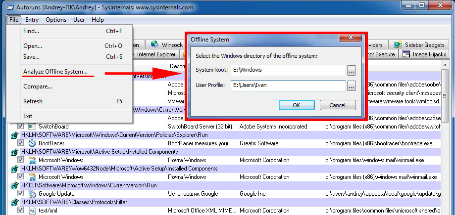 Опция File - Analyze Offline System позволяет получить доступ к автозагрузке выключенной системы, все что вам надо, это указать путь к системный папке и профилю интересующего пользователя. Данная функция может быть полезна в случаях, когда нормальным образом загрузить систему не представляется возможным из-за проблем с автозагрузкой, например из-за SMS-блокировщика или подмены оболочки.