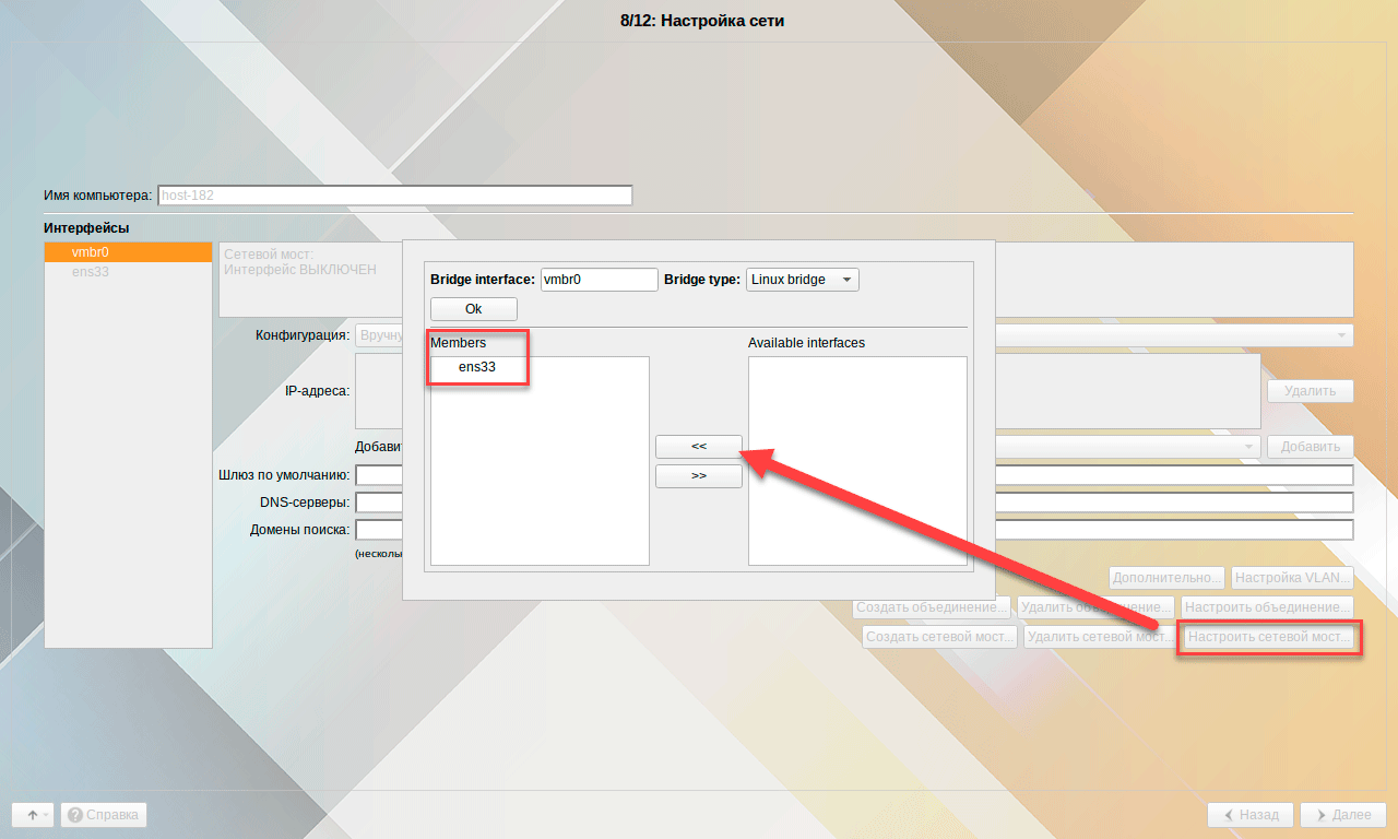 Последующие этапы установки вопросов не вызывают, пока не доберемся до настройки сети, ее желательно выполнить сразу, особенно если Альт для вас новая система. Начнем с настройки сетевого моста, где в раздел Members следует добавить рабочий сетевой интерфейс.