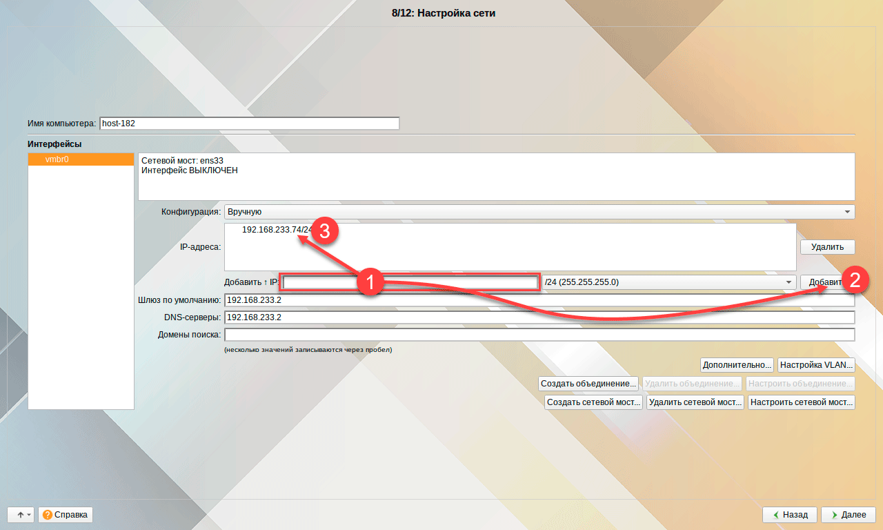 Затем настроим статический адрес для созданного моста, в поле Конфигурация выбираем Вручную и вводим требуемый адрес в поле Добавить IP, после чего нажимаем кнопку Добавить, поле очищается, а адрес попадает выше в блок IP-адреса. Не самый очевидный алгоритм действий, особенно если учесть, что адреса шлюза и DNS-сервера просто вводятся в поля ниже.